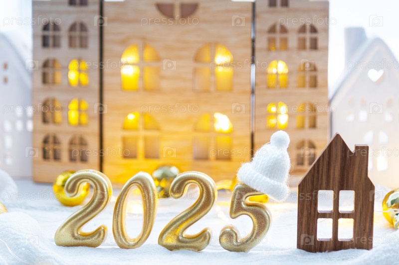 Золотые цифры номер 2025 и крошечный дом на фоне уютных окон дома с теплым светом с праздничным декором из звезд, снега и гирлянд. Открытка с Новым годом, уютный дом
