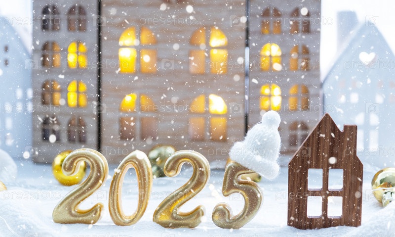 Золотые цифры номер 2025 и крошечный дом на фоне уютных окон дома с теплым светом с праздничным декором из звезд, снега и гирлянд. Открытка с Новым годом, уютный дом