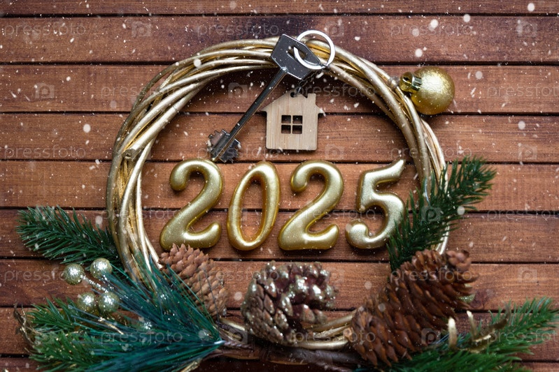 Новогодний ключ от дома с брелком-коттеджем на праздничном коричневом деревянном фоне с номером 2025 в венке, огнями гирлянд. Покупка, строительство, переезд, ипотека, страхование