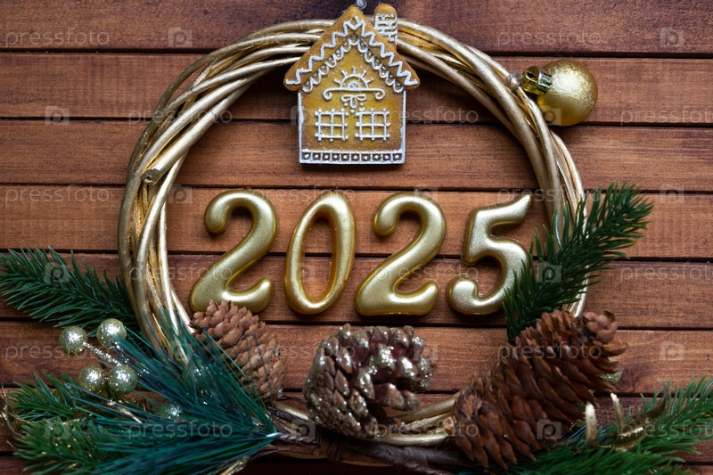 Новогодний ключ от дома с брелком-коттеджем на праздничном коричневом деревянном фоне с номером 2025 в венке, огнями гирлянд. Покупка, строительство, переезд, ипотека, страхование