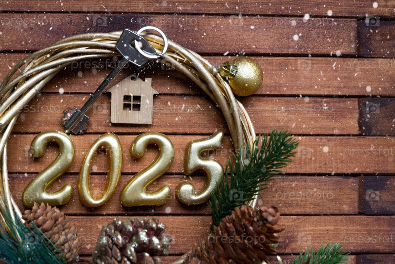 Новогодний ключ от дома с брелком-коттеджем на праздничном коричневом деревянном фоне с номером 2025 в венке, огнями гирлянд. Покупка, строительство, переезд, ипотека, страхование