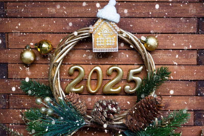 Новогодний ключ от дома с брелком-коттеджем на праздничном коричневом деревянном фоне с номером 2025 в венке, огнями гирлянд. Покупка, строительство, переезд, ипотека, страхование