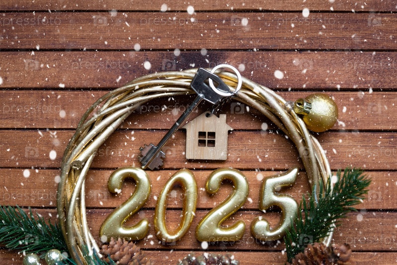 Новогодний ключ от дома с брелком-коттеджем на праздничном коричневом деревянном фоне с номером 2025 в венке, огнями гирлянд. Покупка, строительство, переезд, ипотека, страхование
