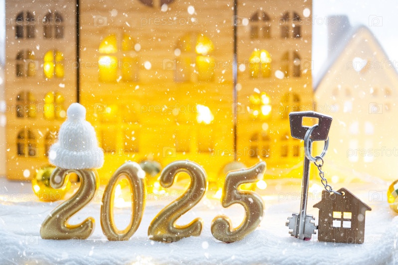Золотые цифры номер 2025, ключ и крошечный дом на фоне уютных окон дома с теплым светом с праздничным декором из звезд, снега и гирлянд. Открытка с Новым годом, уютный дом