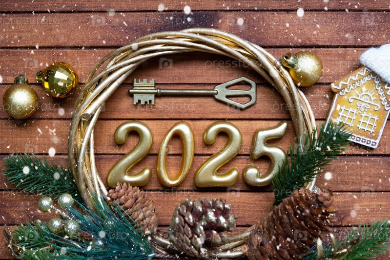 Новогодний ключ от дома с брелком-коттеджем на праздничном коричневом деревянном фоне с номером 2025 в венке, огнями гирлянд. Покупка, строительство, переезд, ипотека, страхование