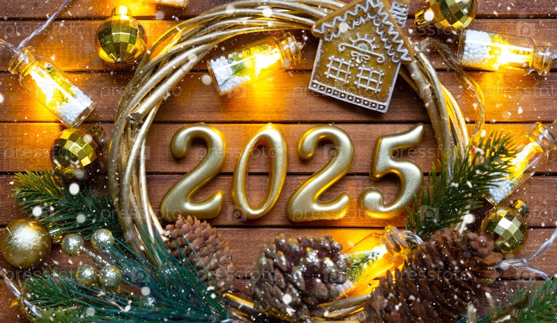 Новогодний ключ от дома с брелком-коттеджем на праздничном коричневом деревянном фоне с номером 2025 в венке, огнями гирлянд. Покупка, строительство, переезд, ипотека, страхование