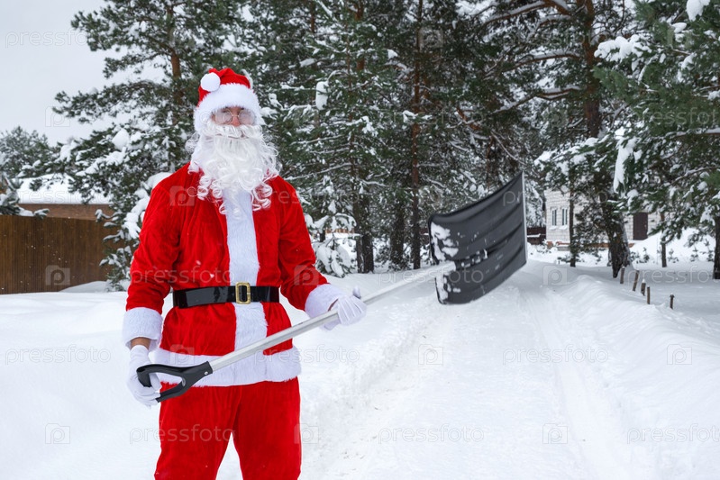 Санта-Клаус чистит снег лопатой зимой на открытом воздухе после снегопада. Уборка улиц в поселке, расчистка проезда для автомобилей, сложные погодные условия к Рождеству и Новому году