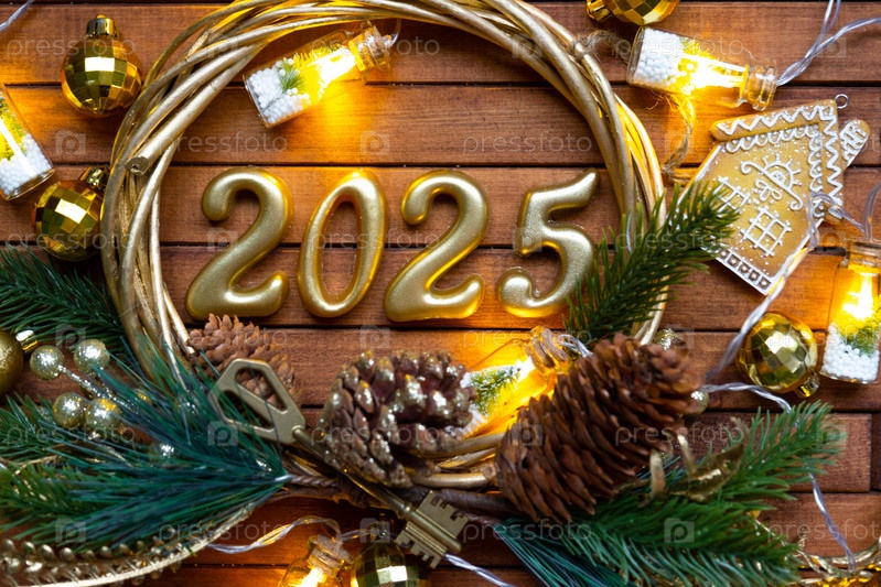 Новогодний ключ от дома с брелком-коттеджем на праздничном коричневом деревянном фоне с номером 2025 в венке, огнями гирлянд. Покупка, строительство, переезд, ипотека, страхование