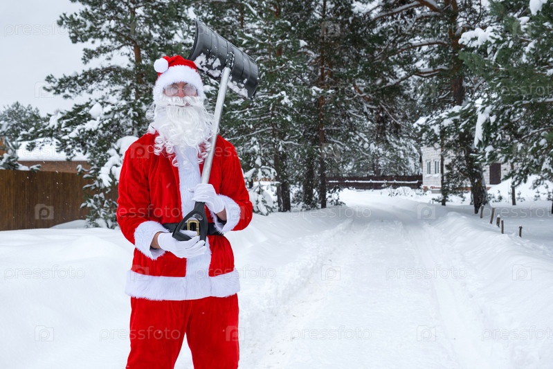Санта-Клаус чистит снег лопатой зимой на открытом воздухе после снегопада. Уборка улиц в поселке, расчистка проезда для автомобилей, сложные погодные условия к Рождеству и Новому году
