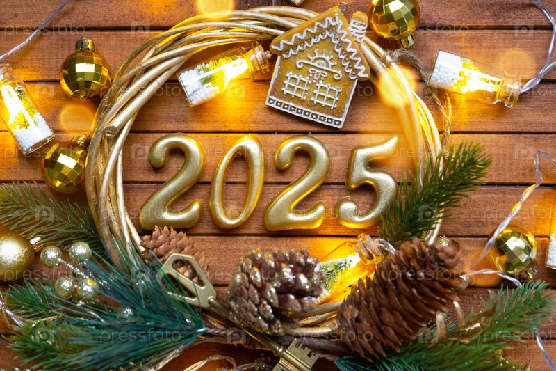 Новогодний ключ от дома с брелком-коттеджем на праздничном коричневом деревянном фоне с номером 2025 в венке, огнями гирлянд. Покупка, строительство, переезд, ипотека, страхование