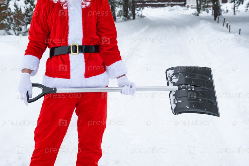 Санта-Клаус чистит снег лопатой зимой на открытом воздухе после снегопада. Уборка улиц в поселке, расчистка проезда для автомобилей, сложные погодные условия к Рождеству и Новому году
