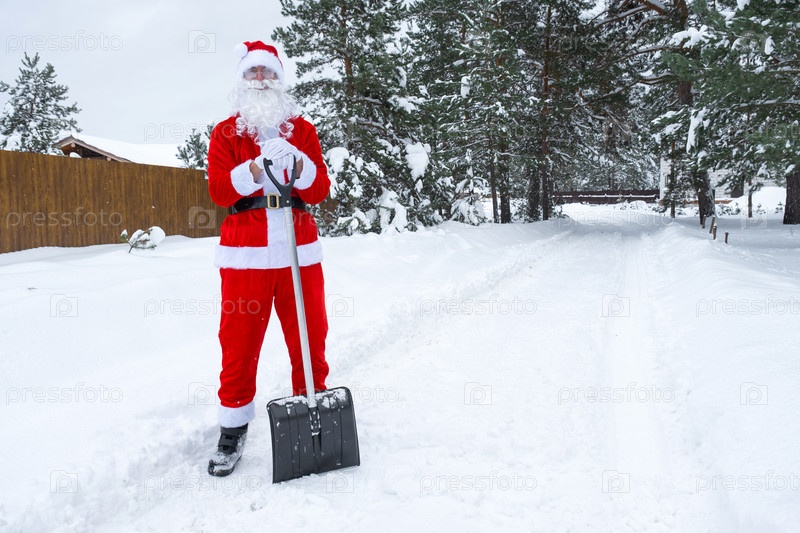 Санта-Клаус чистит снег лопатой зимой на открытом воздухе после снегопада. Уборка улиц в поселке, расчистка проезда для автомобилей, сложные погодные условия к Рождеству и Новому году