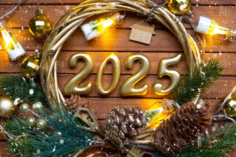 Новогодний ключ от дома с брелком-коттеджем на праздничном коричневом деревянном фоне с номером 2025 в венке, огнями гирлянд. Покупка, строительство, переезд, ипотека, страхование