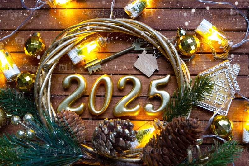 Новогодний ключ от дома с брелком-коттеджем на праздничном коричневом деревянном фоне с номером 2025 в венке, огнями гирлянд. Покупка, строительство, переезд, ипотека, страхование