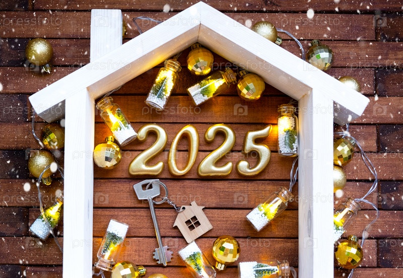 Ключ от дома с коттеджем-брелком на праздничном коричневом деревянном фоне со звездами, огнями гирлянд. Золотые буквы Нового 2025 года под крышей. Покупка, строительство, переезд, ипотека, страхование