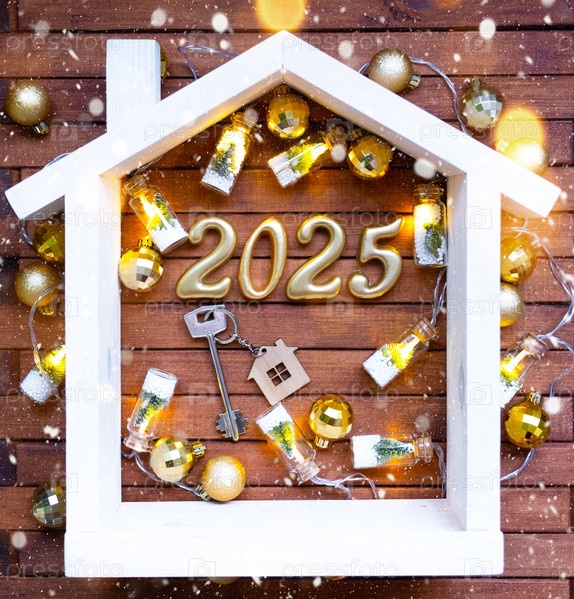 Ключ от дома с брелоком для ключей на праздничном коричневом деревянном фоне со звездами, огнями гирлянд. Золотые буквы Нового 2025 года под крышей. Покупка, строительство, переезд, ипотека, страхование