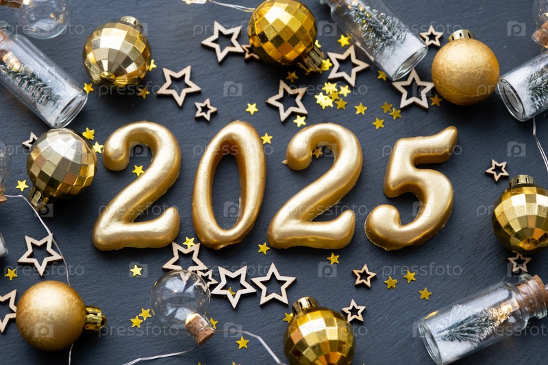 Золотые фигурки 2025 из свечей на фоне черного каменного сланца украшены праздничным декором из звезд, блесток, еловых веток, шаров и гирлянд. Открытка с Новым годом