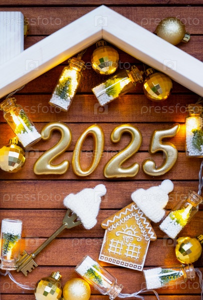 Ключ от дома с брелоком для ключей на праздничном коричневом деревянном фоне со звездами, огнями гирлянд. Золотые буквы Нового 2025 года под крышей. Покупка, строительство, переезд, ипотека, страхование
