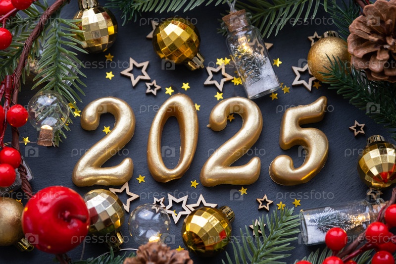 Золотые фигурки 2025 из свечей на фоне черного каменного сланца украшены праздничным декором из звезд, блесток, еловых веток, шаров и гирлянд. Открытка с Новым годом
