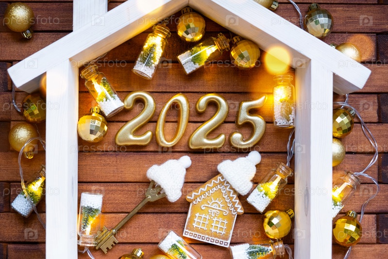 Ключ от дома с коттеджем-брелком на праздничном коричневом деревянном фоне со звездами, огнями гирлянд. Золотые буквы Нового 2025 года под крышей. Покупка, строительство, переезд, ипотека, страхование