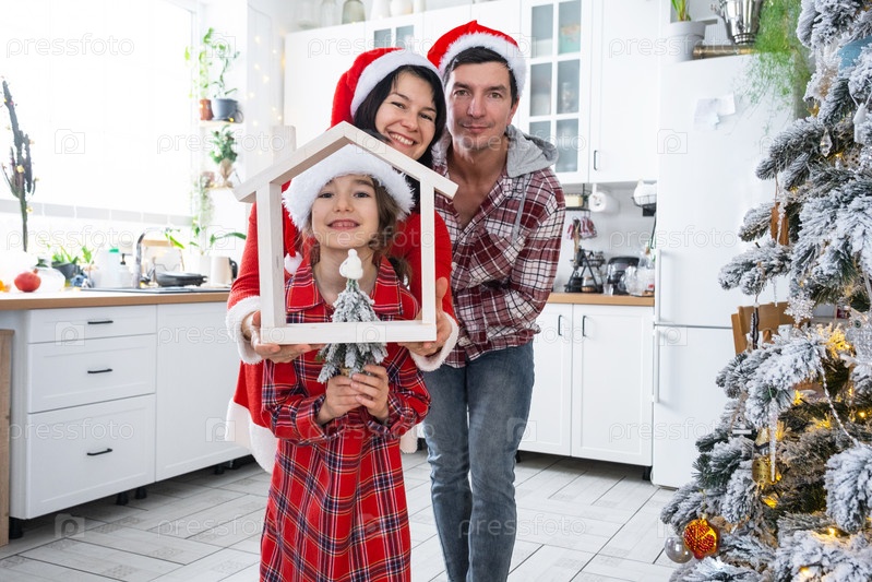 Счастливая семья в шляпах Санты с крошечным домиком в уютном доме с рождественским декором праздничной белой кухни. Подарок на Новый год. Страхование, переезд в новый дом, ипотека, аренда и покупка недвижимости