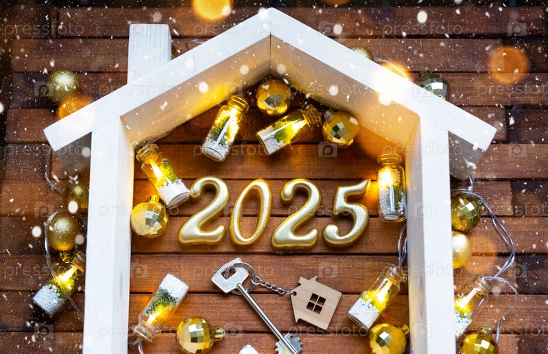 Ключ от дома с брелоком для ключей на праздничном коричневом деревянном фоне со звездами, огнями гирлянд. Золотые буквы Нового 2025 года под крышей. Покупка, строительство, переезд, ипотека, страхование