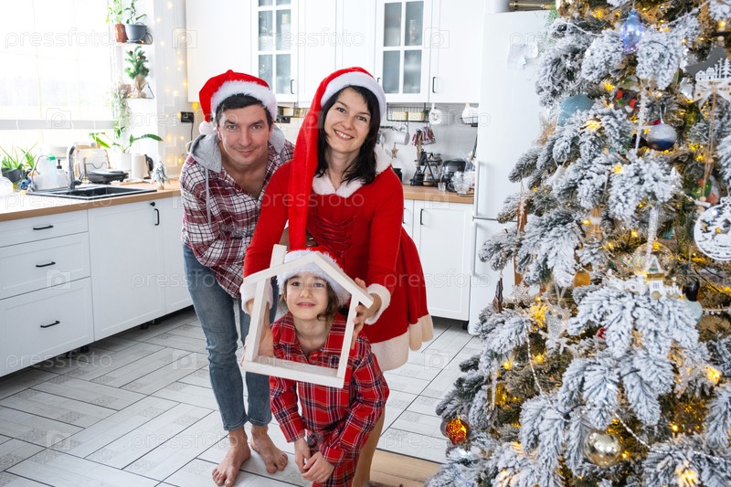 Счастливая семья в шляпах Санты с крошечным домиком в уютном доме с рождественским декором праздничной белой кухни. Подарок на Новый год. Страхование, переезд в новый дом, ипотека, аренда и покупка недвижимости
