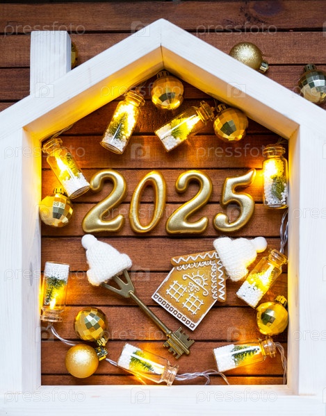 Ключ от дома с брелоком для ключей на праздничном коричневом деревянном фоне со звездами, огнями гирлянд. Золотые буквы Нового 2025 года под крышей. Покупка, строительство, переезд, ипотека, страхование