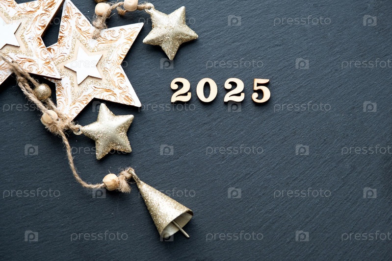 С Новым годом - деревянные буквы и цифры 2025 на праздничном черном фоне с блестками, звездами, снегом. Привет, открытка. Календарь, обложка