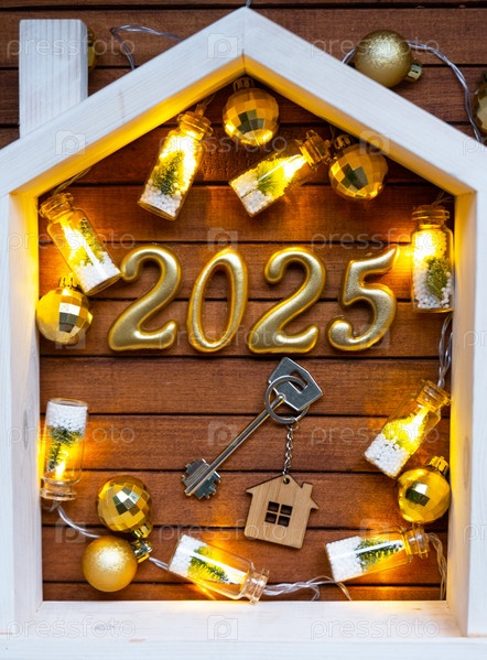 Ключ от дома с брелоком для ключей на праздничном коричневом деревянном фоне со звездами, огнями гирлянд. Золотые буквы Нового 2025 года под крышей. Покупка, строительство, переезд, ипотека, страхование