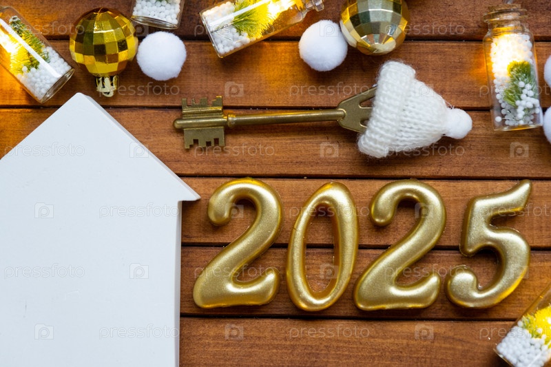Ключ от дома с крошечной фигуркой дома макет на праздничном коричневом деревянном фоне, огни гирлянд. Деревянные буквы к Новому 2025 году, поздравительная открытка. Покупка, строительство, переезд, ипотека, страхование