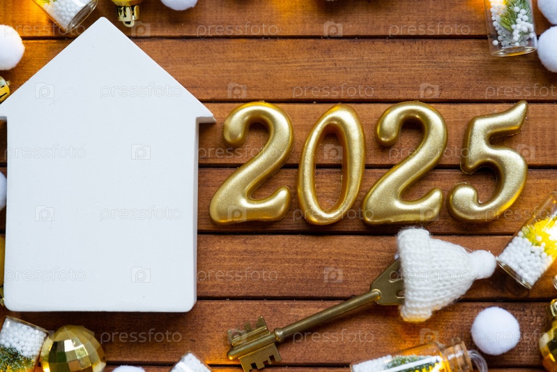Ключ от дома с крошечной фигуркой дома макет на праздничном коричневом деревянном фоне, огни гирлянд. Деревянные буквы к Новому 2025 году, поздравительная открытка. Покупка, строительство, переезд, ипотека, страхование