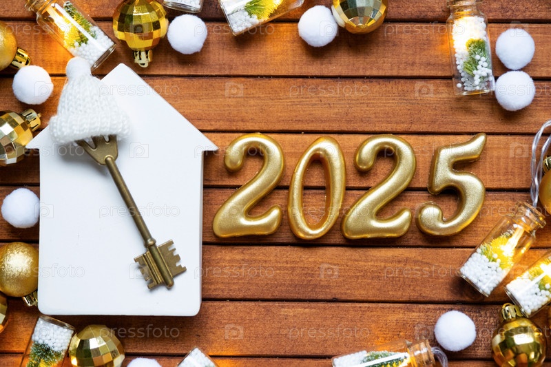 Ключ от дома с крошечной фигуркой дома макет на праздничном коричневом деревянном фоне, огни гирлянд. Деревянные буквы к Новому 2025 году, поздравительная открытка. Покупка, строительство, переезд, ипотека, страхование