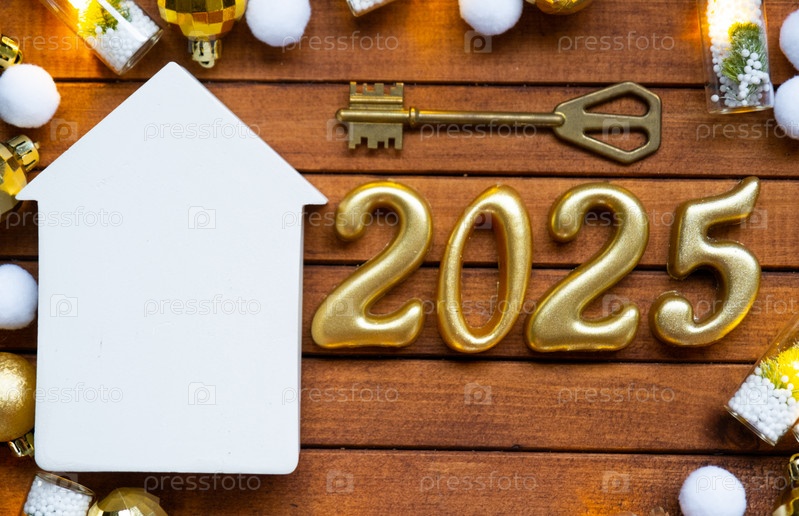Ключ от дома с крошечной фигуркой дома макет на праздничном коричневом деревянном фоне, огни гирлянд. Деревянные буквы к Новому 2025 году, поздравительная открытка. Покупка, строительство, переезд, ипотека, страхование
