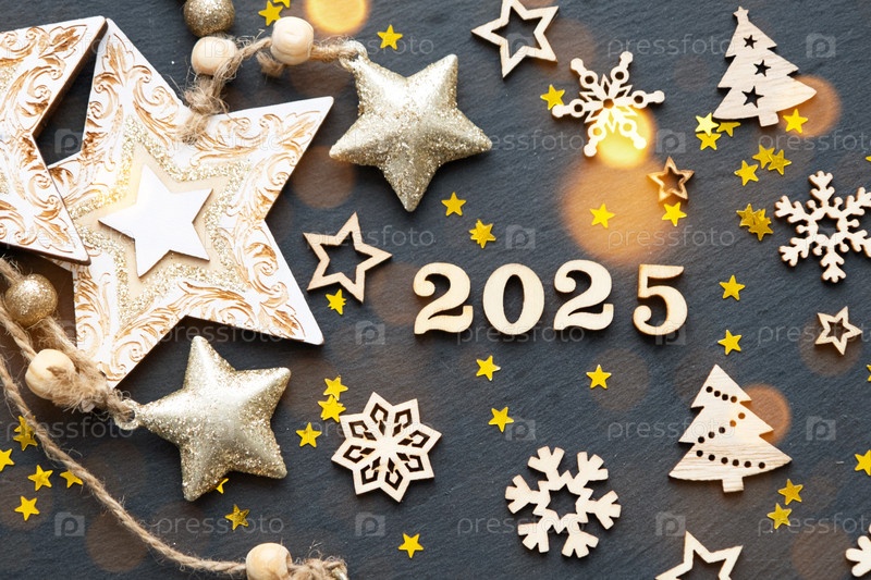 С Новым годом - деревянные буквы и цифры 2025 на праздничном черном фоне с блестками, звездами, снегом. Привет, открытка. Календарь, обложка