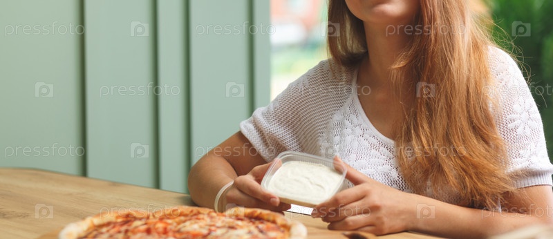 Девушка обмакивает кусок пиццы в соусе в пластиковом контейнере, прежде чем съесть его