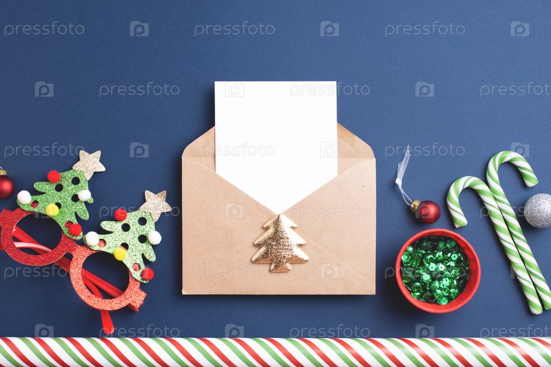 Вид сверху конверта с чистым листом бумаги, рождественскими безделушками и украшениями на синем фоне