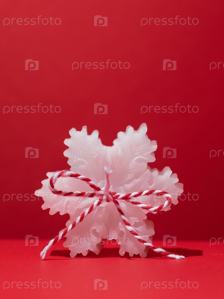 Одна белая ароматическая свеча в форме снежинки на красном фоне с копировальным пространством