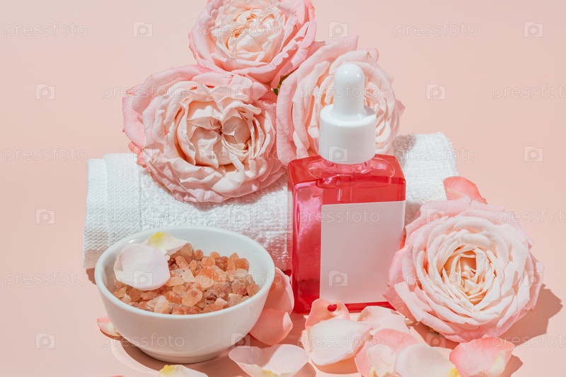Стеклянная бутылка без торговой марки с крышкой-капельницей с каплей сыворотки на розовом фоне. Косметический контейнер для лекарств, эфирных масел, массажных масел, рядом с миской с гималайской солью и хлопковым полотенцем