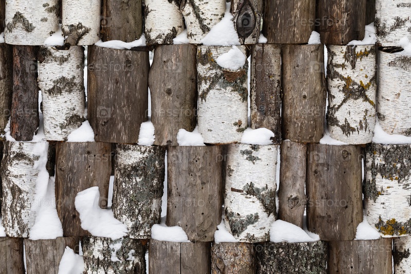 Деревянный фон из березовых и сосновых бревен со снегом