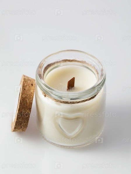 Ароматическая свеча в открытой стеклянной банке на светлом фоне