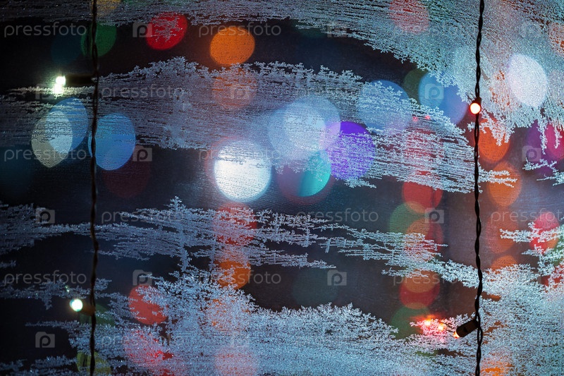 Фон из замороженного стекла с цветной гирляндой и боке, шаблон для дизайнера