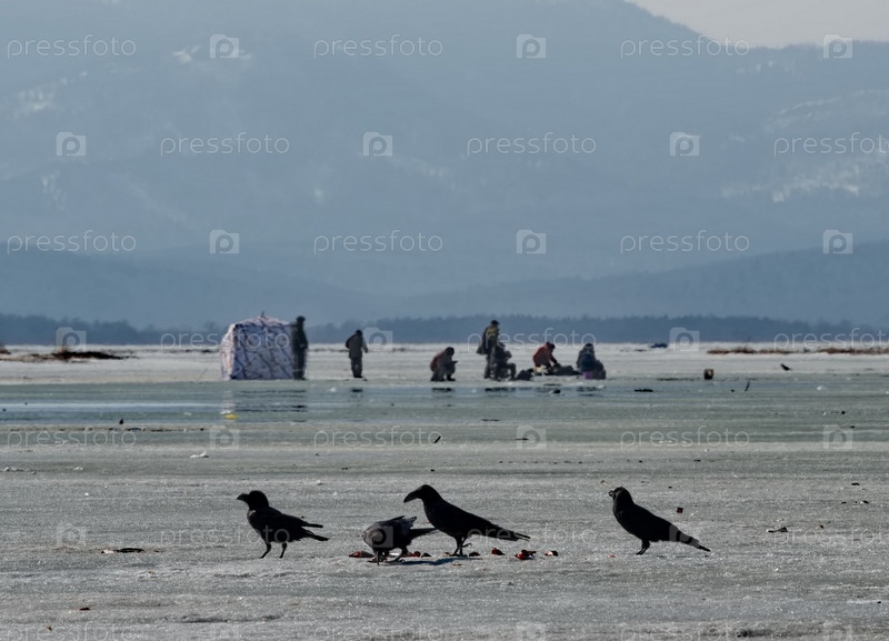 Россия. Остров Сахалин. Черные вороны собирающие оставленную рыбаками навагу в устье реки Найба на побережье Тихого океана