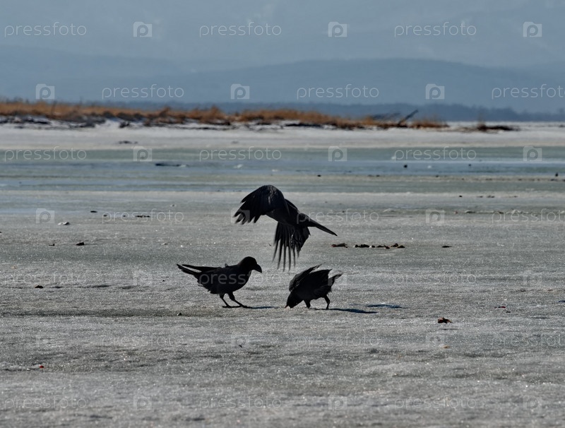 Россия. Остров Сахалин. Черные вороны собирающие оставленную рыбаками навагу в устье реки Найба на побережье Тихого океана