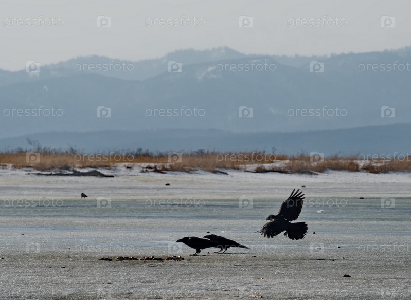 Россия. Остров Сахалин. Черные вороны собирающие оставленную рыбаками навагу в устье реки Найба на побережье Тихого океана