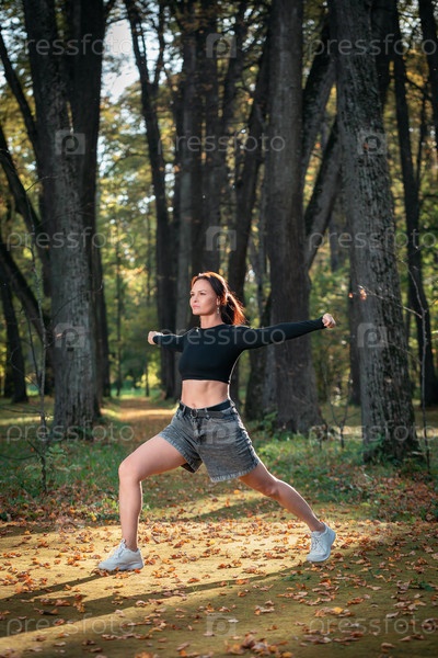 Спортивная привлекательная женщина выполняет вариацию упражнений Вирабхадрасаны, позу воина, тренируется, стоя на пешеходной дорожке в парке в теплый солнечный осенний день