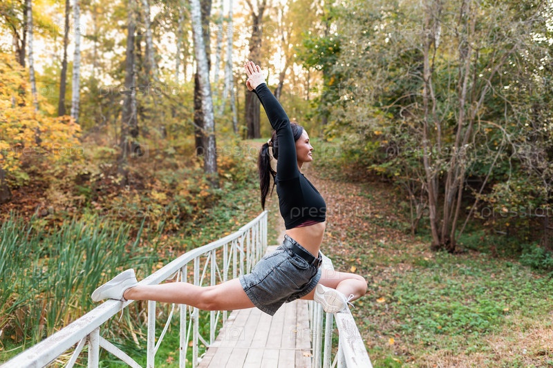 Привлекательная женщина, выполняющая вариацию упражнения Эка Пада Раджакапотасана, поза голубя, сидящая на перилах деревянного пешеходного моста в парке