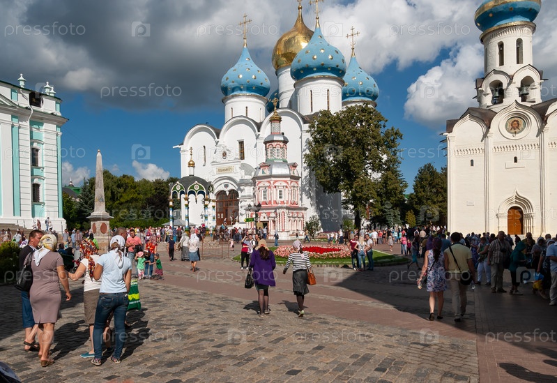 Паломники и туристы на площади монастыря Сергиевой Лавры. Они пришли поклониться преподобному Сергию Радонежскому. Сергиев Посад, Россия