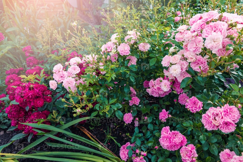 Красивые красные и розовые кустовые розы в летнем саду