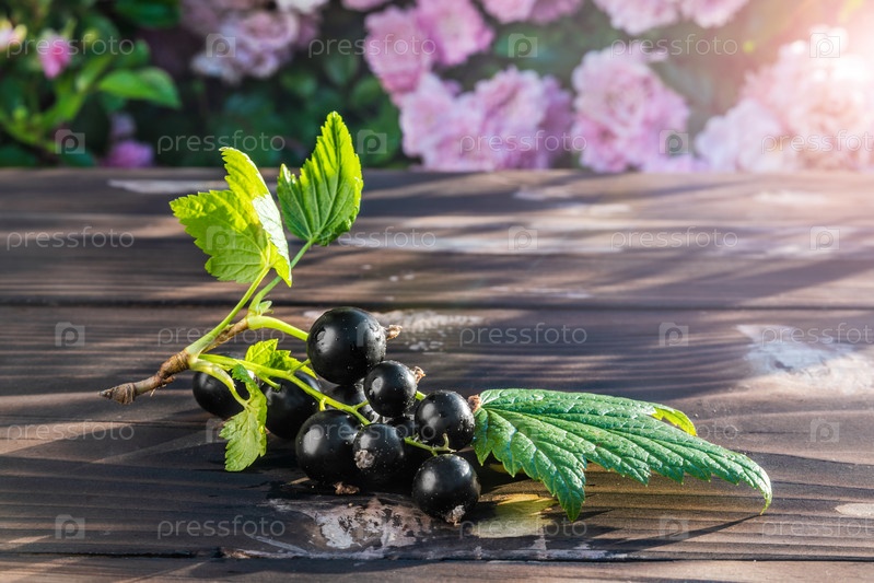 Ветка спелой черной смородины на деревянном столе